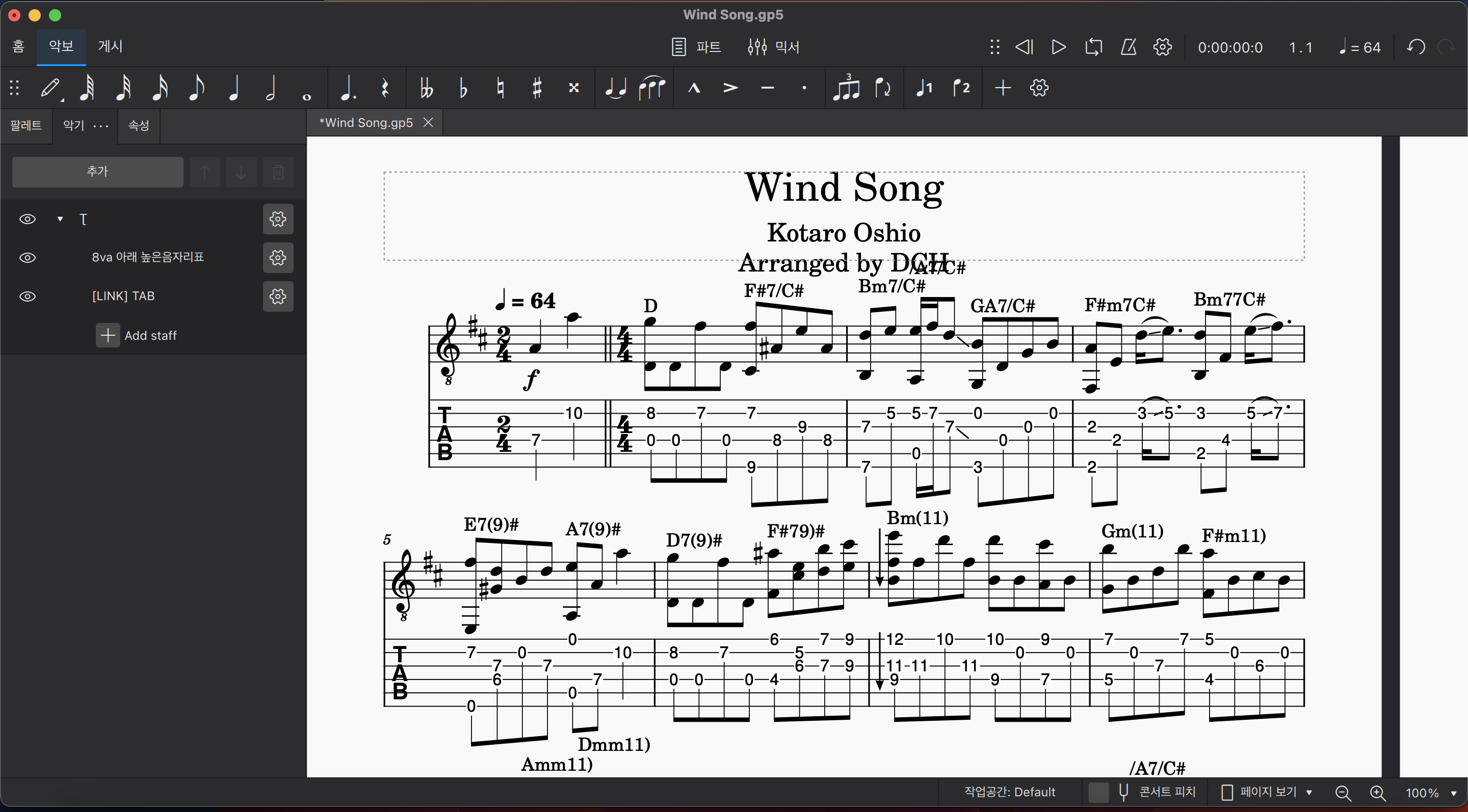 위에서 설명한 것과 동일하게 link 된 악보를 '6줄 타브 전체'로 변경하시면 아래와 같이 표준 악보와 타브악보를 동시에 보실 수 있습니다.