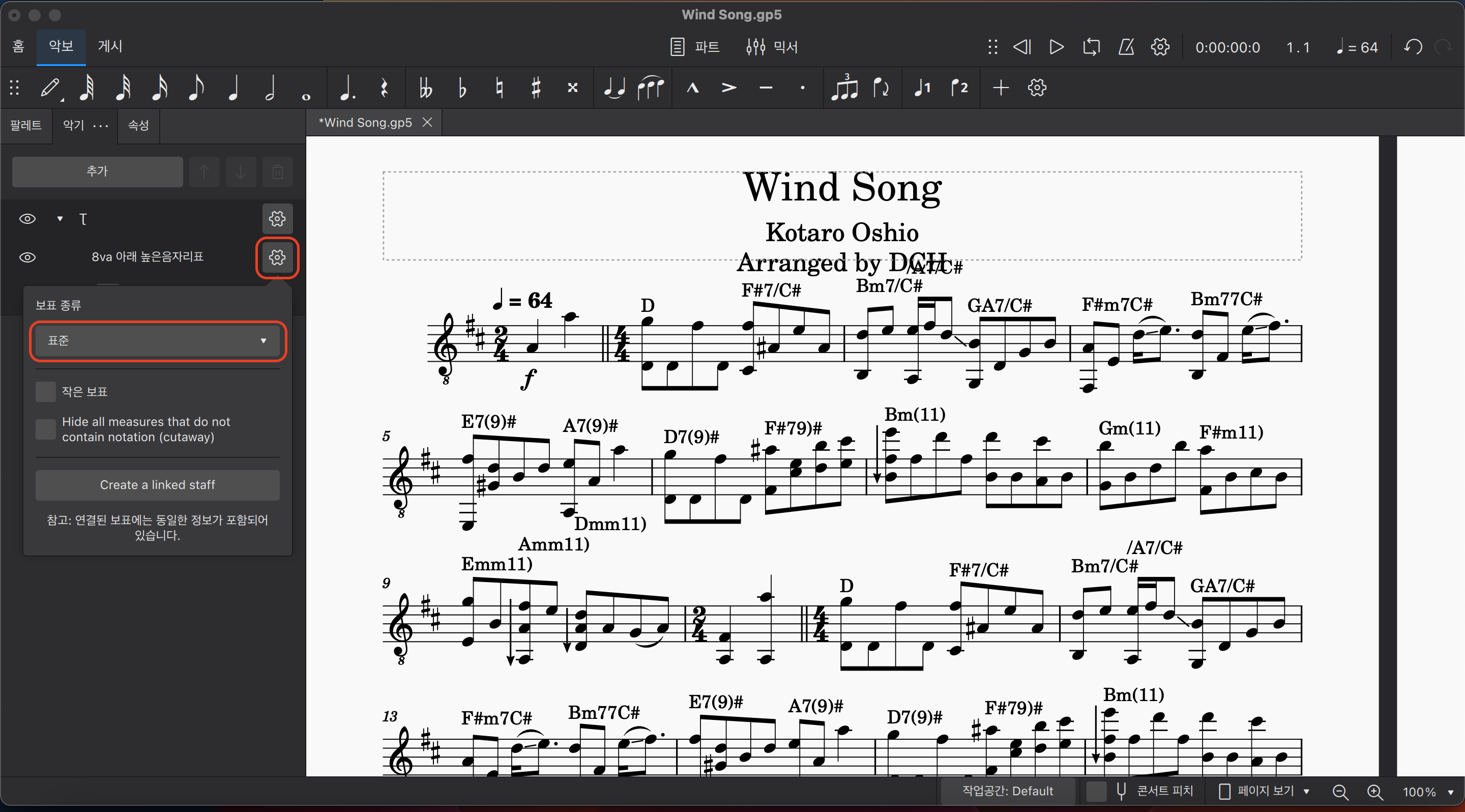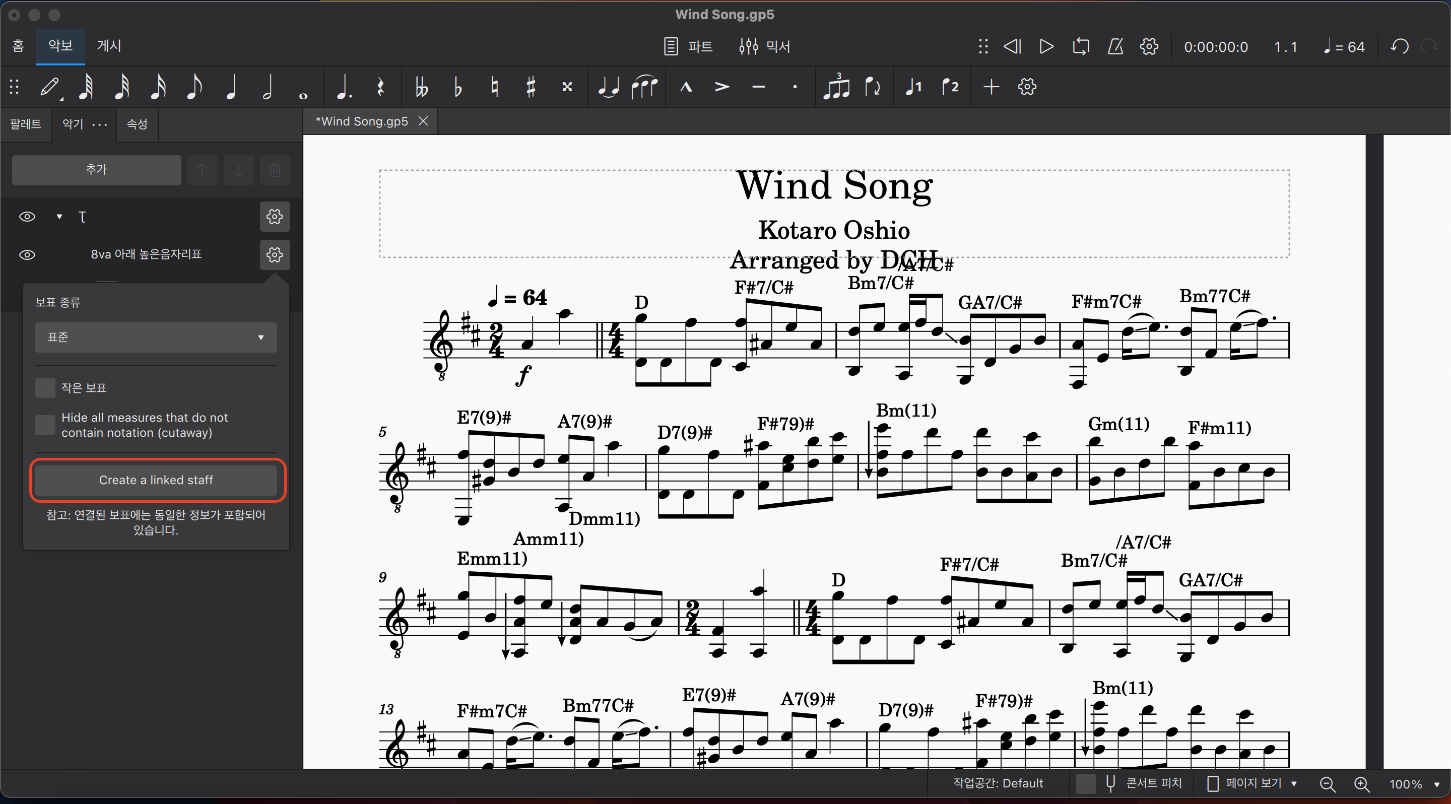 표준 악보와 타브악보를 동시에 보고 싶으시다면 아래의 'Create a linked staff'을 클릭하시게 되면,
